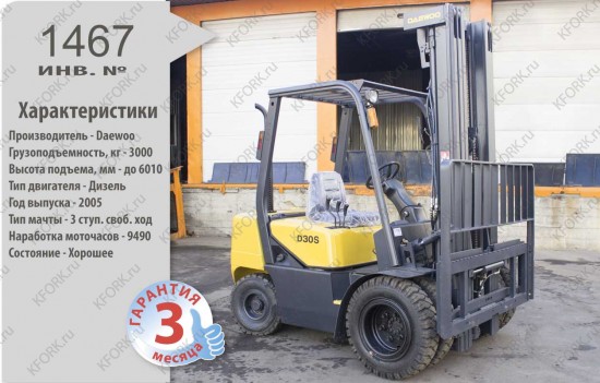 Дизельный автопогрузчик Daewoo Б/У с интентарным номером 1467 2005 года выпуска. Состояние - Хорошее. Имеет грузоподъемность 3000 кг. Гарантия: 3 мес или 500 м/час.