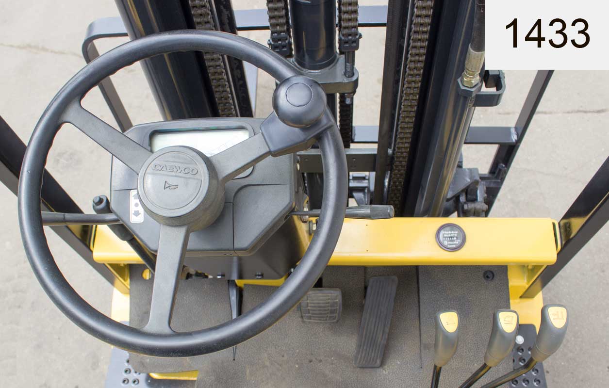 Электрический погрузчик Daewoo Б/У с интентарным номером 1433 2004 года выпуска. Состояние - Хорошее. Имеет грузоподъемность 1600 кг. Гарантия: 3 мес или 500 м/час.